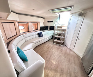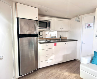 Nous mettons à disposition de nos clients un grand réfrigérateur avec congélateur pour stocker les aliments et les boissons, ainsi qu'un bar-réfrigérateur en haut pour un espace de réfrigération supplémentaire. Une salle de bain est à la disposition des clients pendant la navigation. Un coin salon en bas est ouvert pour le plaisir des clients.